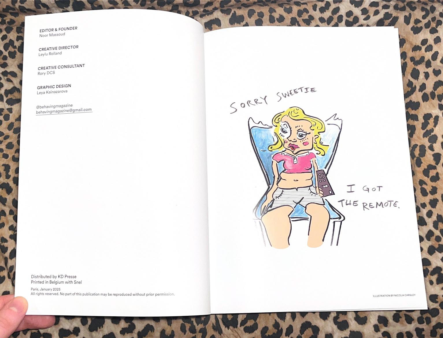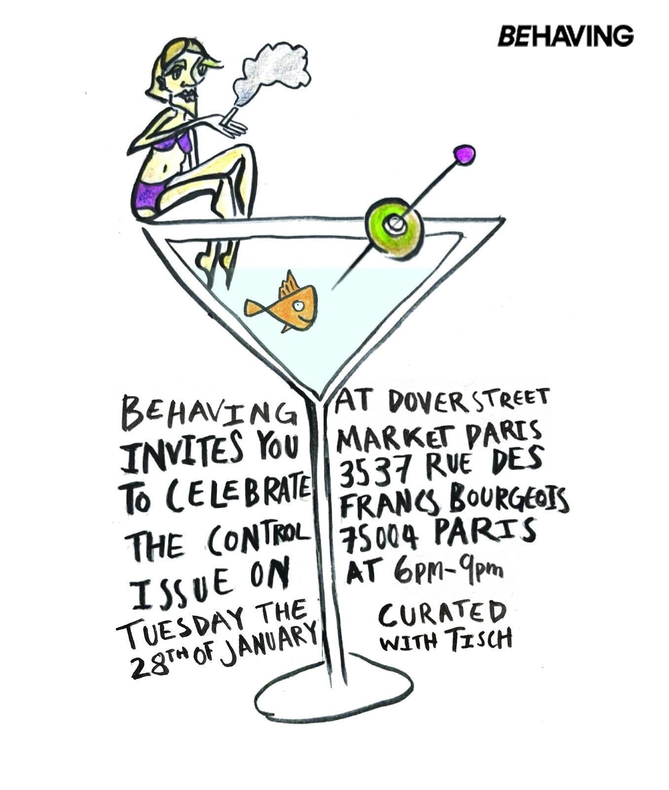 Invite for Behaving launch in collaboration with dover street market Paris illustrated by Nicola Carsley